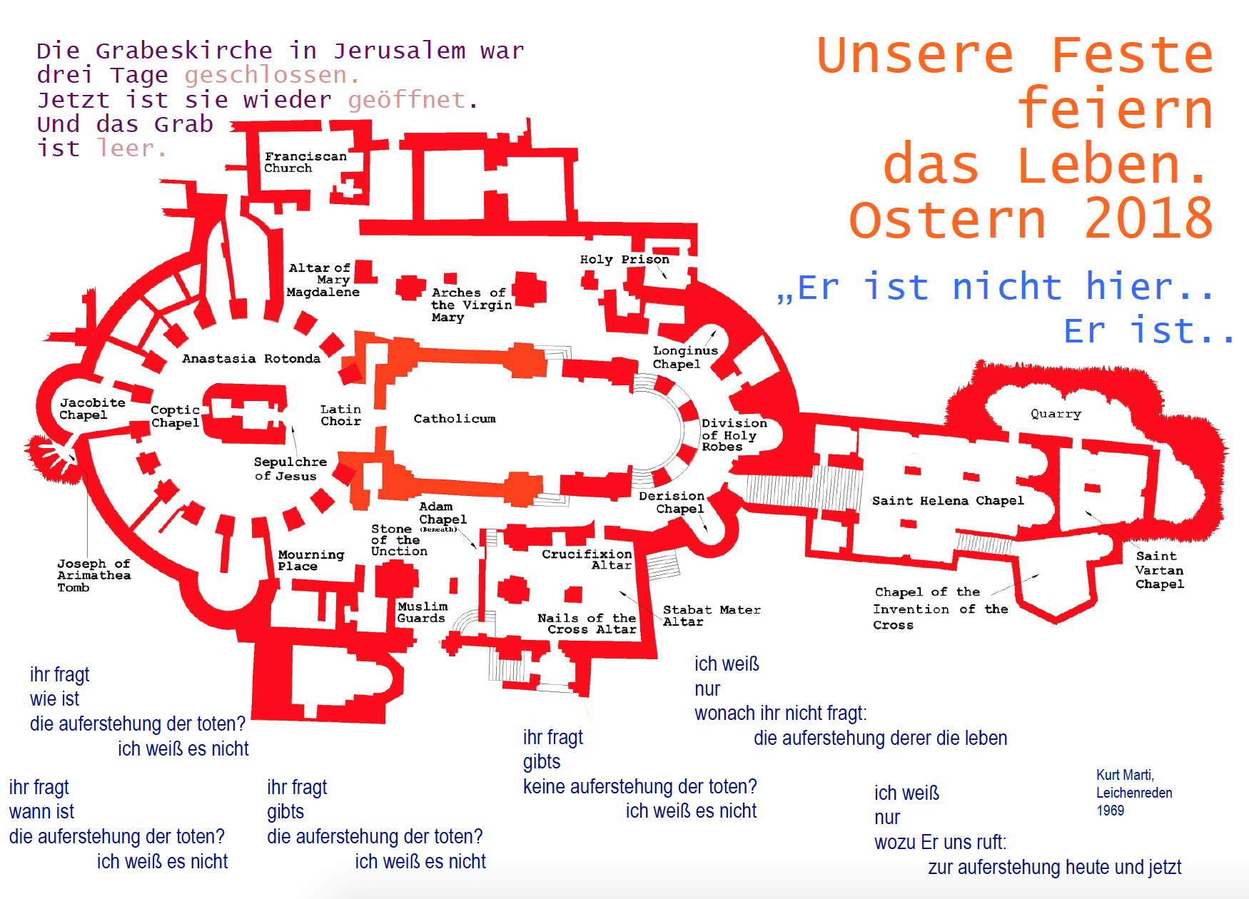 2018 Für drei Tage waren die Pforten der Grabeskirche verschlossen. Seit ihres Bestehens, war es eine der wenigen Vorfälle, die die Leiter der Kirchen am Heiligen Grab bewogen haben, die Grabeskirche zu schließen und den Dienst für die Pilger einzustellen. Grund dafür war eine politische Debatte im Israelischen Parlament. Dort wurde ein Gesetzesentwurf geplant, der die Enteignung von Kirchlichen Grundstücken, die an Privatinvestoren verkauft wurden zu ermöglichen. Hinzu kamen versandte Mahnungen der Stadtverwaltung von Jerusalem, die die Beschlagnahmung kirchlicher Grundstücke angeordnet haben soll. Als Reaktion auf die Verletzung des Status Quo, der die Rechte der Kirchen im Heiligen Land sichert, hatten die Leiter der Kirchen daraufhin beschlossen, die Grabeskirche auf unbestimmte Zeit zu schließen. Gleichzeitig wurde eine Erklärung, die sogenannte „Church Lands Bill“ verfasst, adressiert an das israelische Parlament.