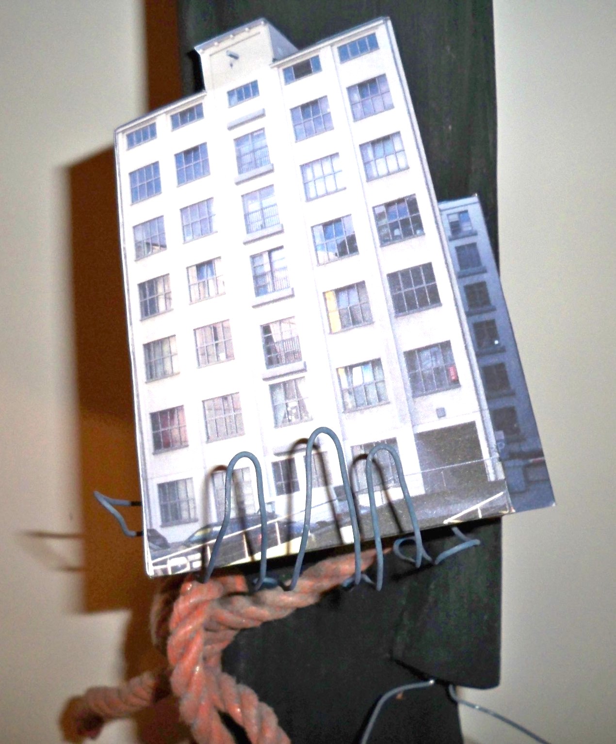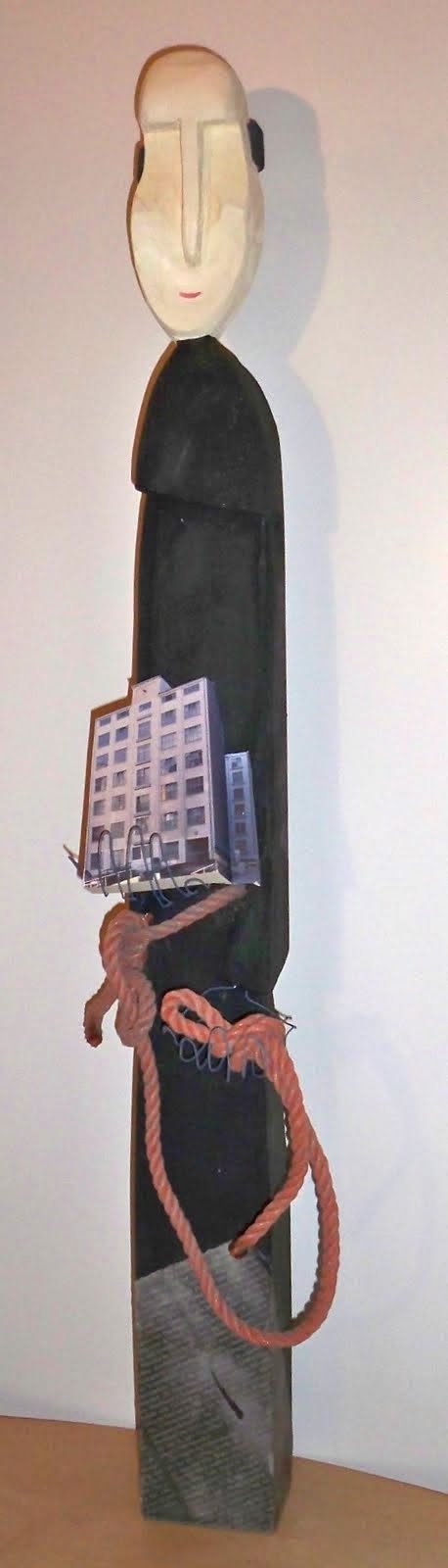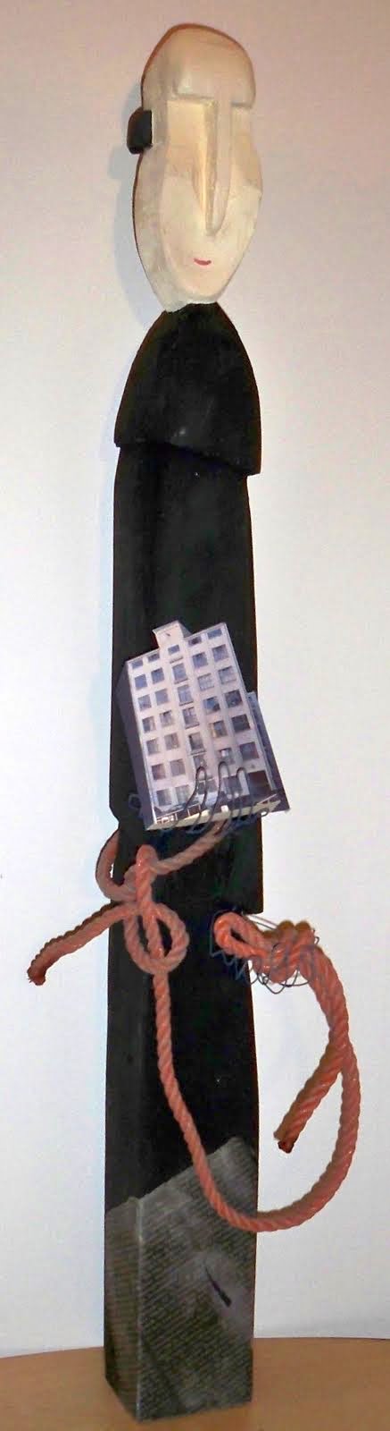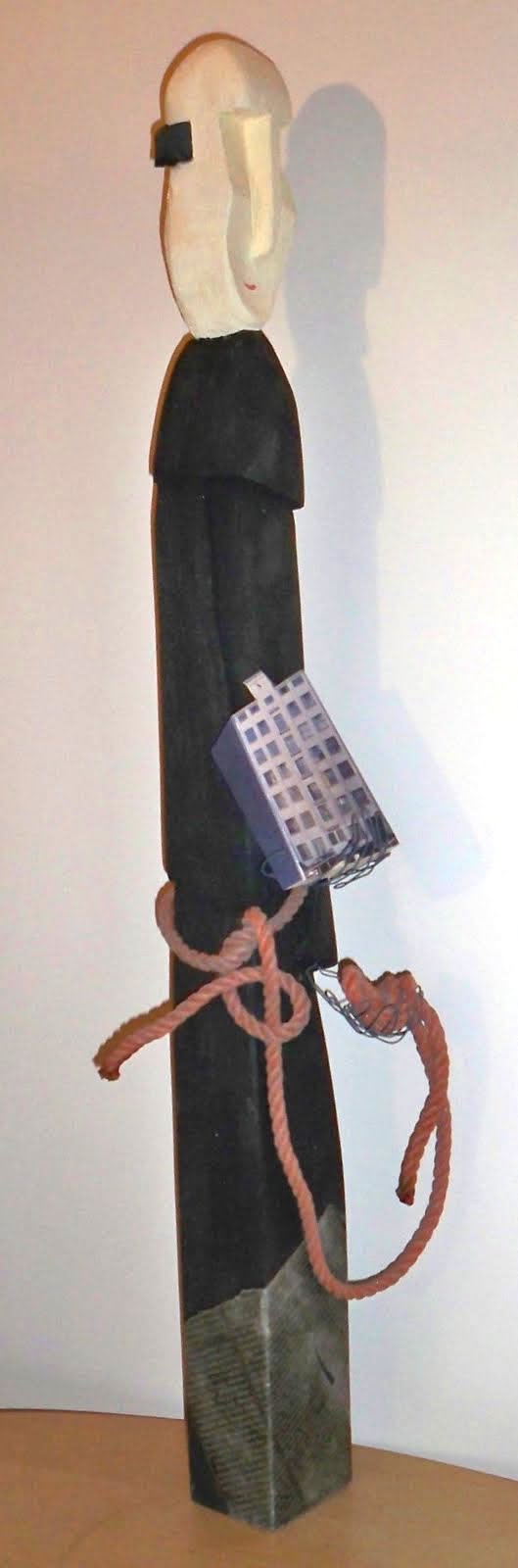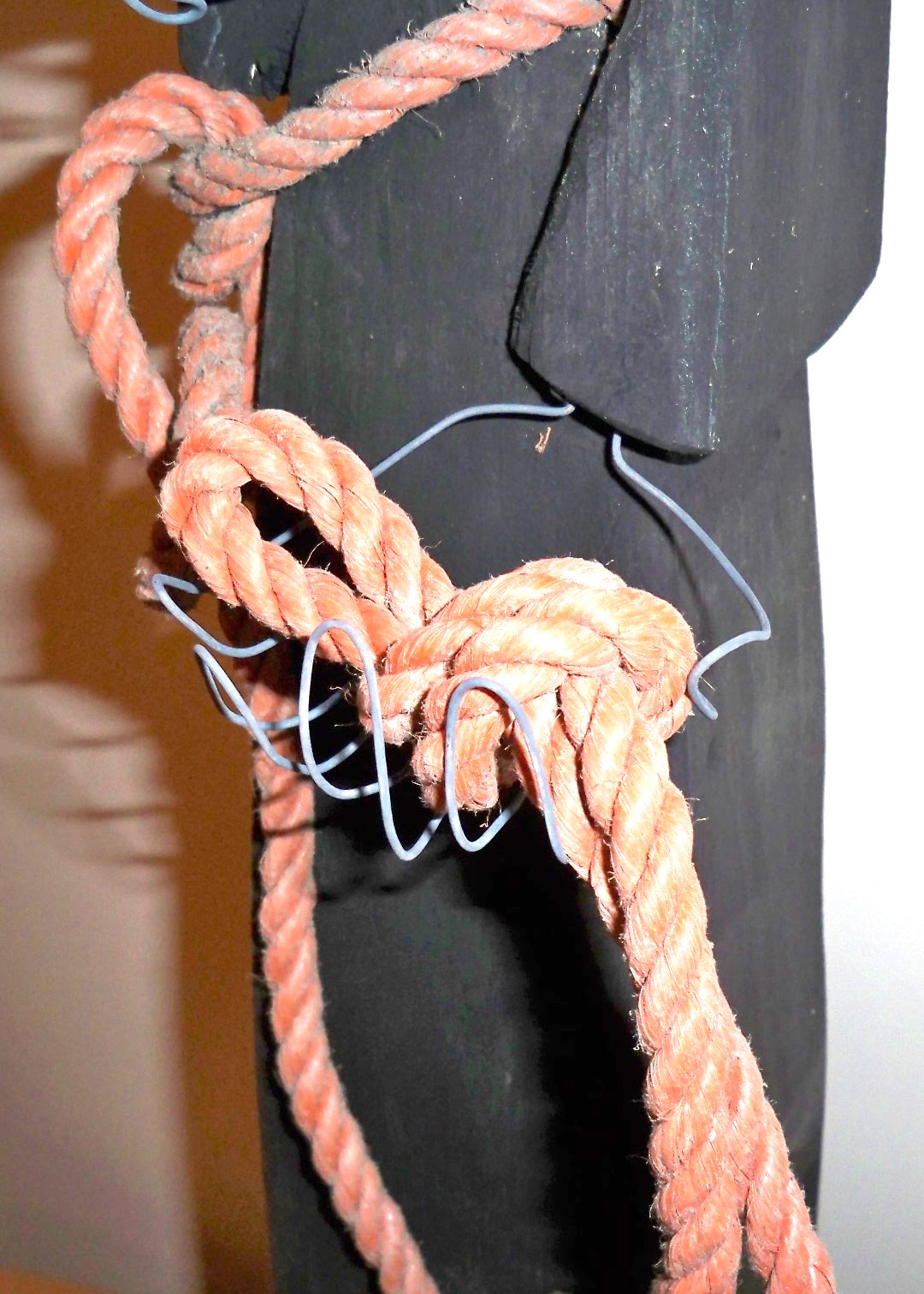 4. Ansgar von Hamburg (801-865) XII2011 Kantholz 7x9x100cm, Abtönfarbe, Draht - Attribute: Modell vom Künstlerhaus Wendenstrasse, Zingulum (Gürtel) als orangefarbige synthetische Leine (geschlagenes Tauwerk), schwarze Kutte, Zeitungsausschnitt über V-Leute im Verfassungsschutz (DIE ZEIT)