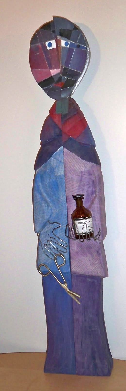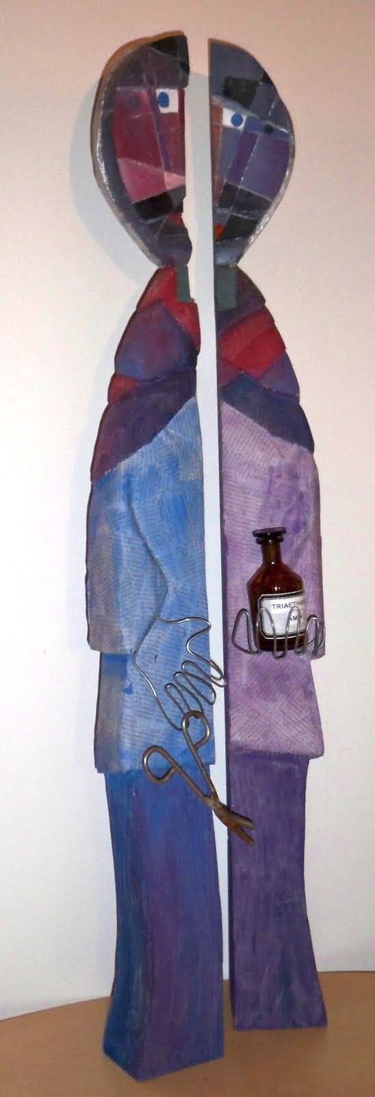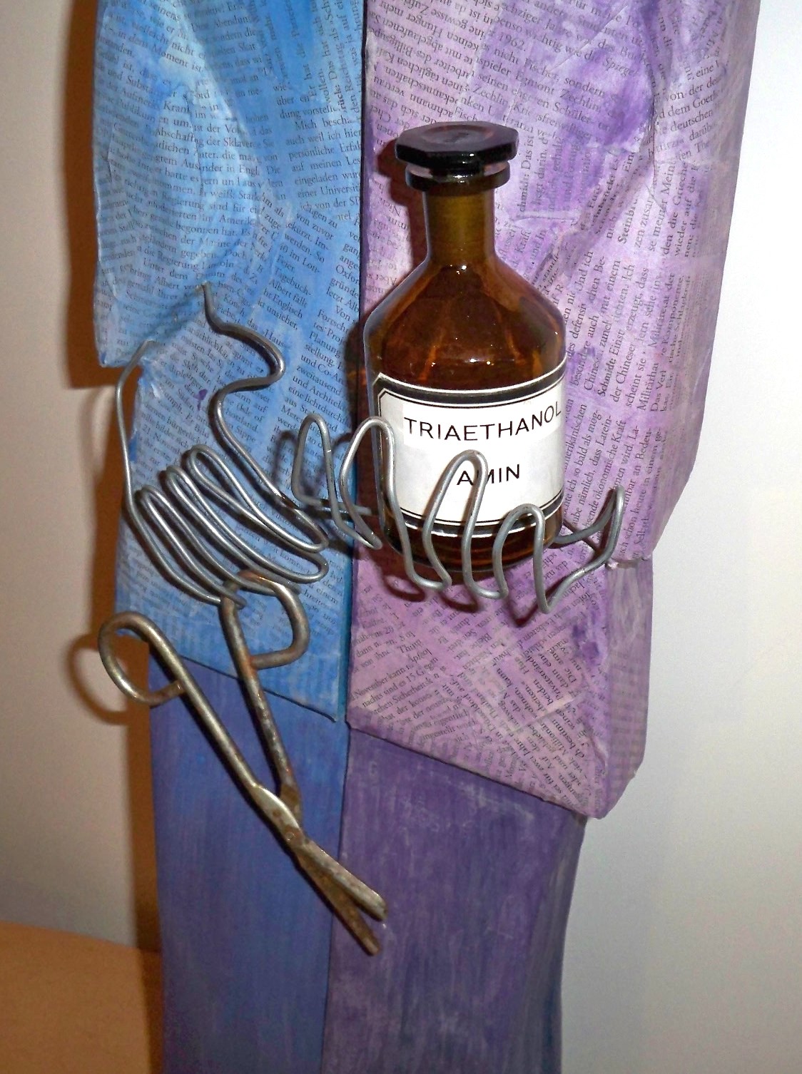 2.+3. Cosmas und Damian (*Syrien +283 Türkei) Reliquien seit dem 9.Jh in Essen XII2011 Zwei Kanthölzer 7x9x100cm, Abtönfarbe, Draht Attribute: Laborflasche, Pflasterschere, Zeitungsartikel (DIE ZEIT): Gespräch über geopolitische Lage